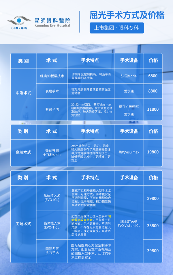 2021年昆明眼科医院近视手术价格表